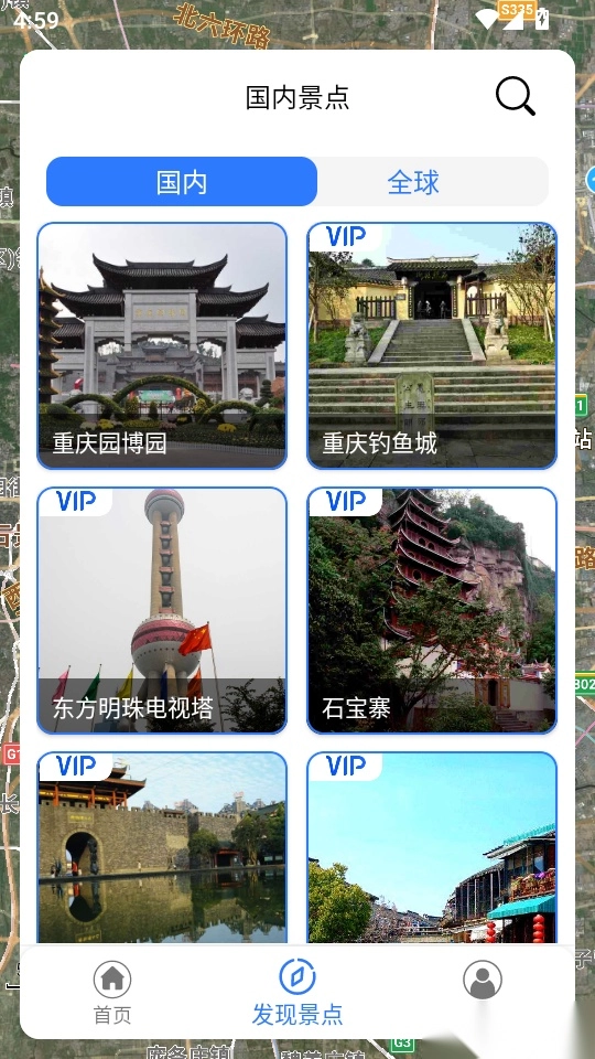 在软件首页底部的功能菜单栏中找到“发现景点”按钮,点击该按钮即可进入下一步操作。