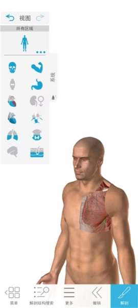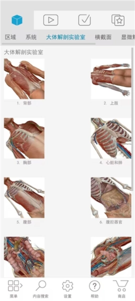 1、进入解剖和生理学软件中,我们可以看见人体区域、系统、大体解剖实验室、显微镜解剖结构等选项;
