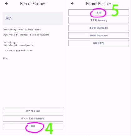 查看已挂载的插槽,接着进行刷入操作:先刷入AK3压缩包,待显示刷入成功后重启设备,重启完成即可成功刷入。