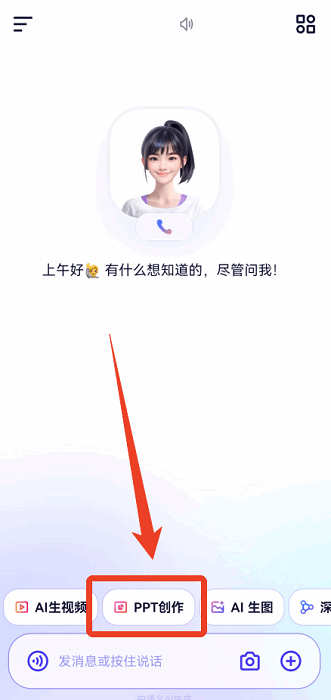 1、向右滑动输入框上面的功能,找到【PPT创作】。