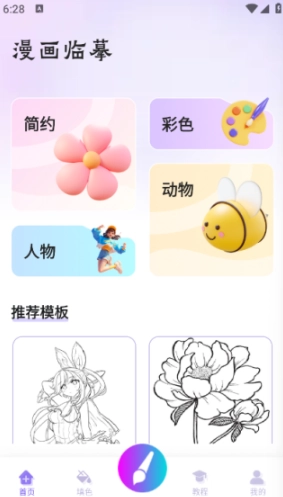 1、首页设有简约、彩色、人物、动物等临摹素材板块,并提供推荐模板。