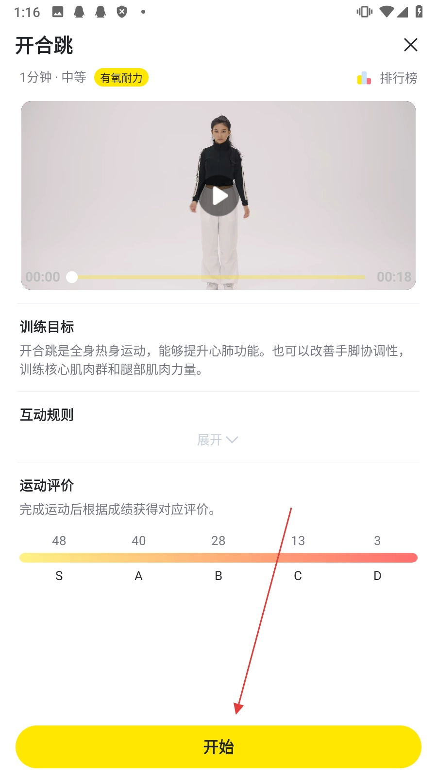 2、在页面里点击【开合跳】选项,即可进入开合跳的运动详情页面。