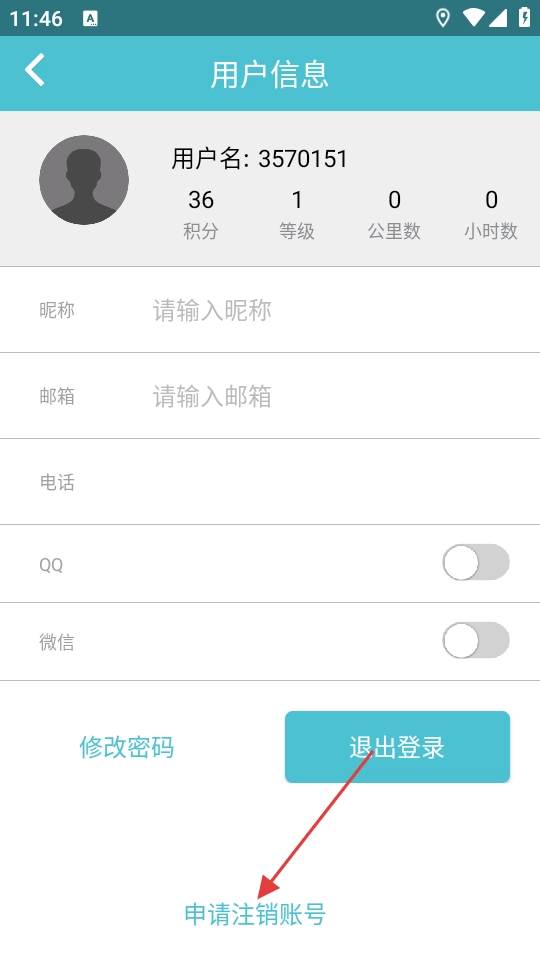 3、进入用户信息页面后,找到并点击【申请注销账号】按钮,即可启动账号注销流程。