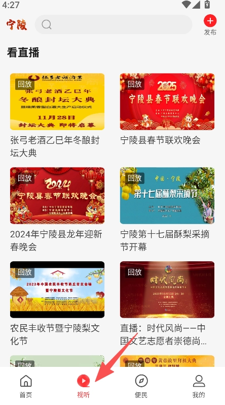 打开软件进入视听板块查看直播回放内容。