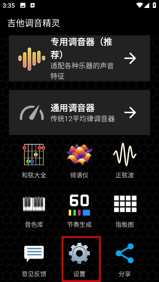 进入主界面后,找到底部的【设置】按钮并点击即可;此外,主界面还设有专用调音器、通用调音器等功能模块。