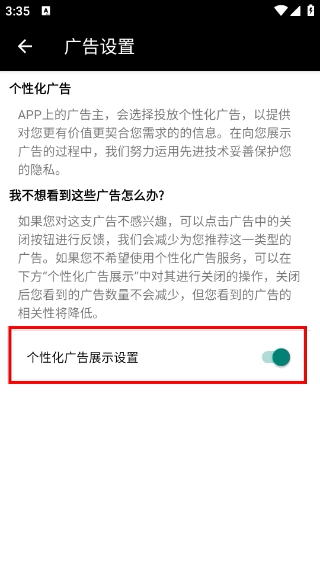 进入广告设置页面后,找到【个性化广告展示设置】对应的开关,你可以通过开启或关闭这个开关,来调整个性化广告的展示状态。