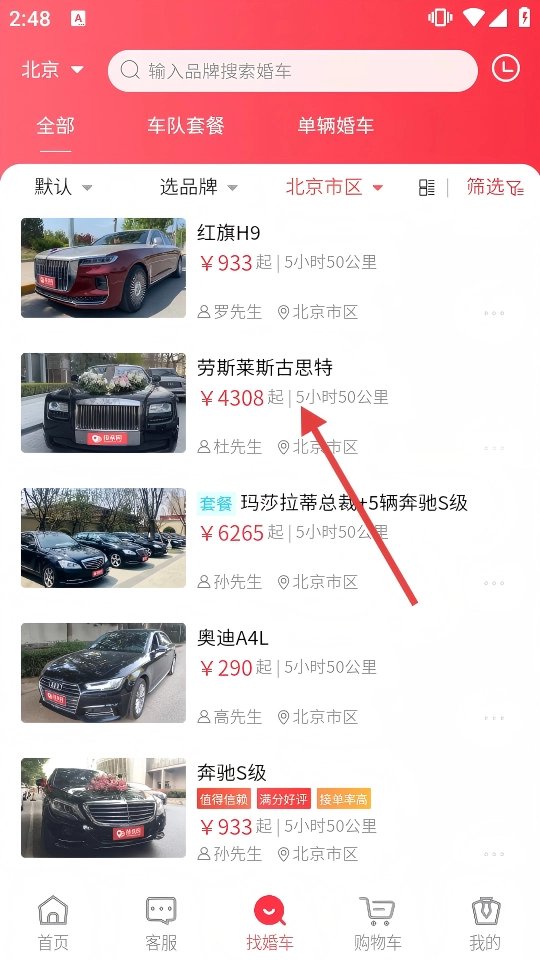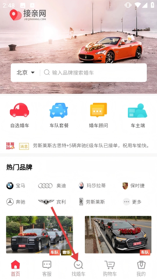 点击首页底部的【找婚车】按钮,就能进入找婚车页面。