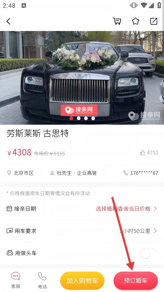 在婚车选择页面浏览婚车清单,挑选自己喜欢的婚车,例如【劳斯莱斯古思特】。