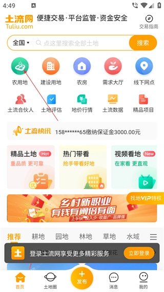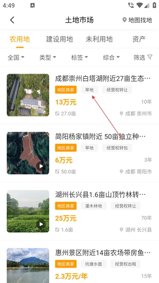 进入首页后,点击【农用地】功能入口,即可进入农用地相关市场页面。