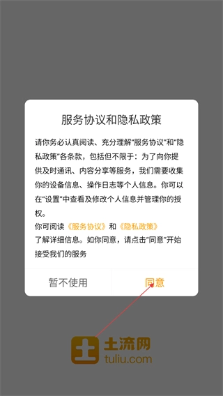 在服务协议与隐私政策的弹窗里点击【同意】按钮,就能开启土流网的使用之旅啦。