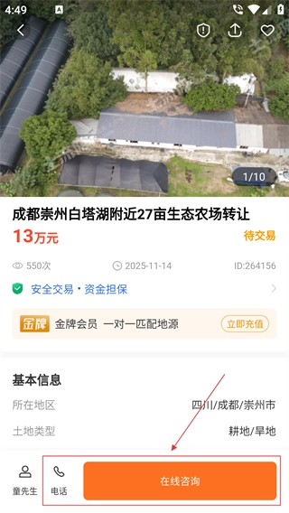 在土地详情页面,点击【在线咨询】按钮,就能开展咨询操作。