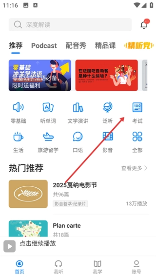 每日为用户推送RFI、TV5等法语媒体的最新听力内容,实时同步前沿资讯,助力用户在知晓时事的过程中提升听力理解能力。