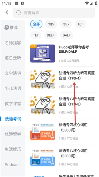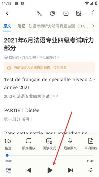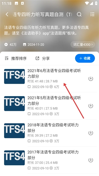 在详情页中找到并点击【2026年6月法语专业四级考试听力部分】这个选项,就能进入对应的听力内容播放页面了。