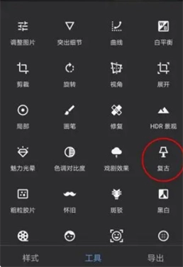 复古滤镜位于Snapseed核心调整面板的第四排第四位。