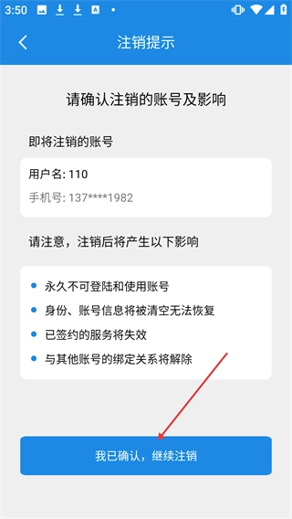 在【注销提示】页面核实账号信息并了解注销的相关影响后,点击【我已确认,继续注销】按钮。