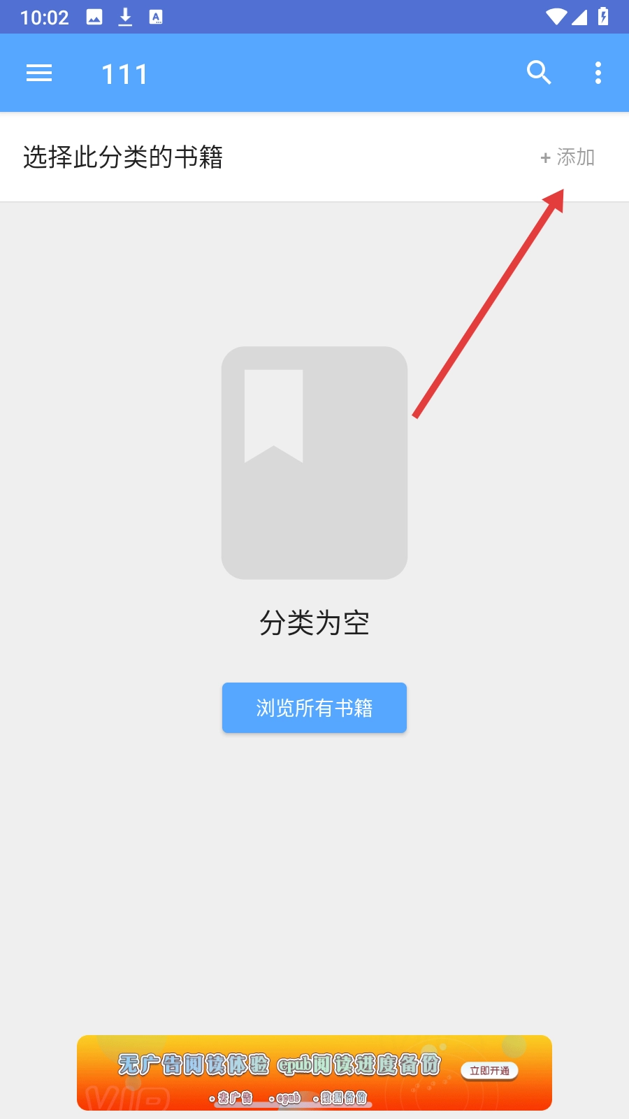 4、进入新分类页面后,点击【+添加】按钮,即可开始将书籍添加到该分类中。