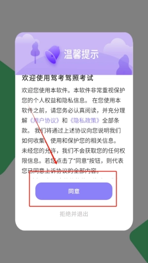 1、点击同意并进入应用界面,确保遵守相关使用条款,顺利开启学习旅程,进入高效驾驶考试备考模式。