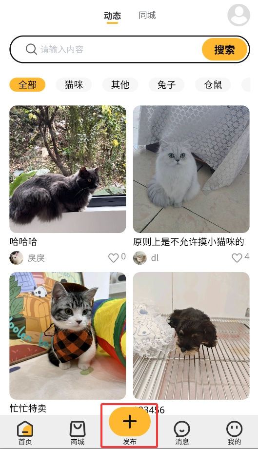 点击底部的加号按钮,就能上传宠物的照片或者视频,还可以编辑文字内容,发布属于自己的个人动态。