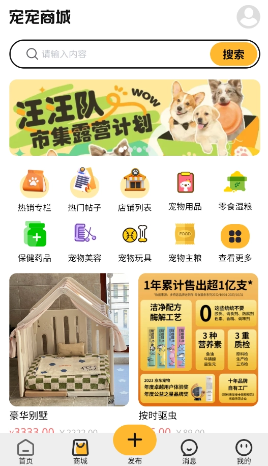 3、进入“宠物商城”板块,浏览并选购宠物食品、玩具等各类用品。