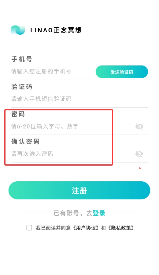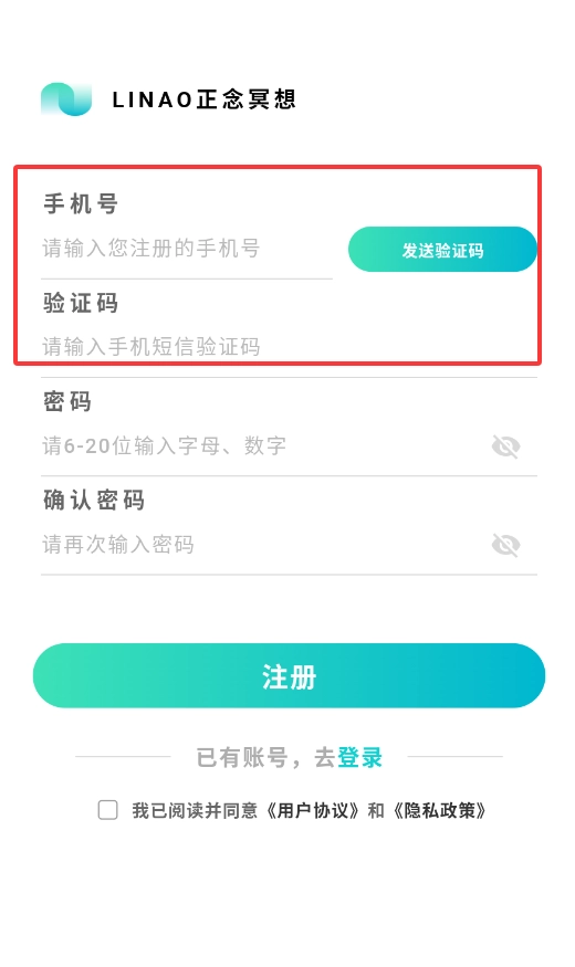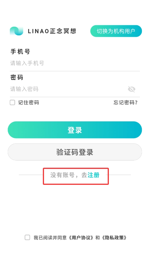 1、打开LINAO正念冥想应用后,在登录界面点击“注册账号”按钮,即可开启注册流程。
