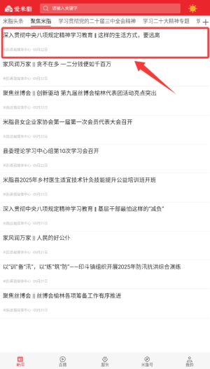 1、打开爱米脂应用后,在首页显眼处找到红色的“聚焦米脂”栏目入口,点击该入口就能进入本地热点新闻的聚合页面。