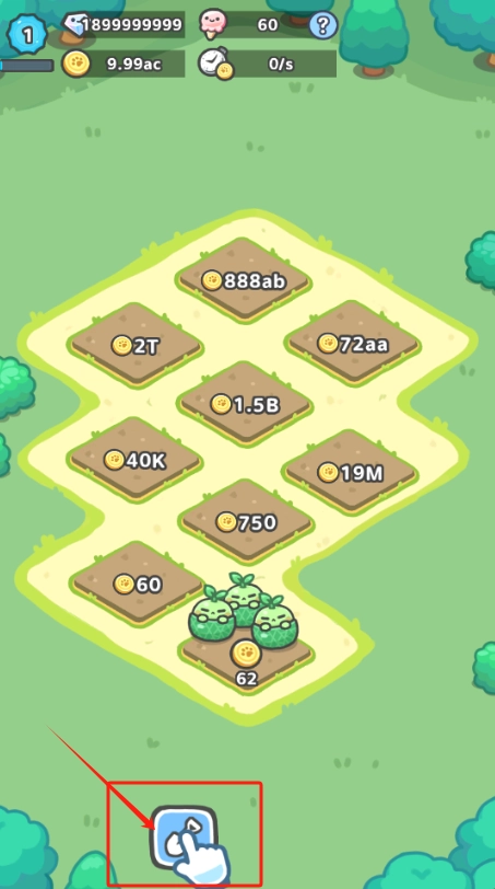 1、点击底部的箭头按钮即可收获作物,田地上的数字对应着作物产量,界面左上角会显示当前拥有的金币和资源数量。