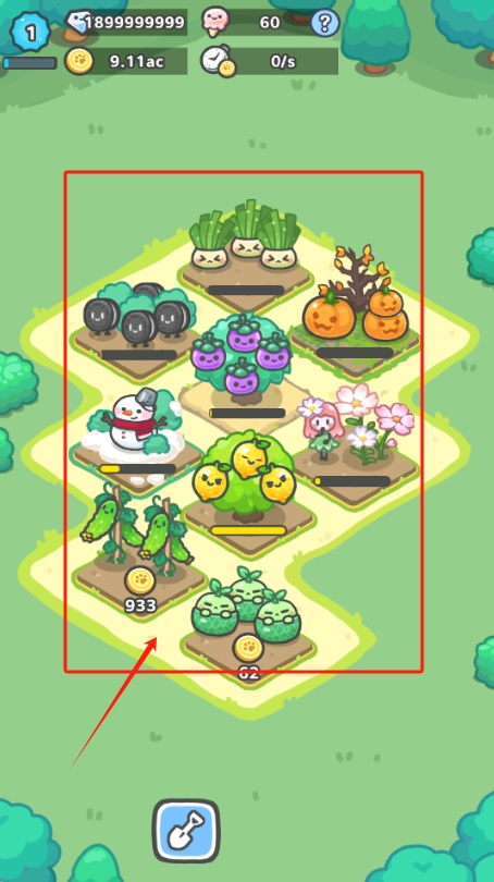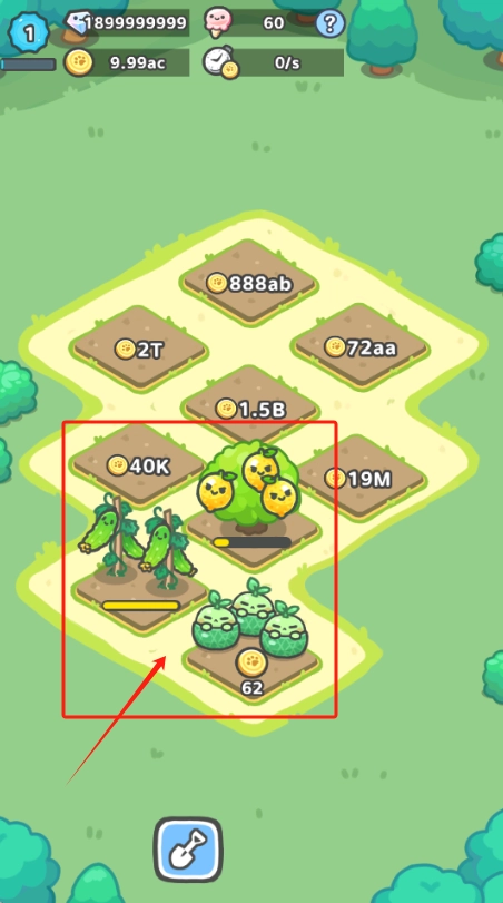 2、红框标注的区域内是已经成熟的作物,点击“40K”“19M”“62”这些数字,就能收取相应的农产品。