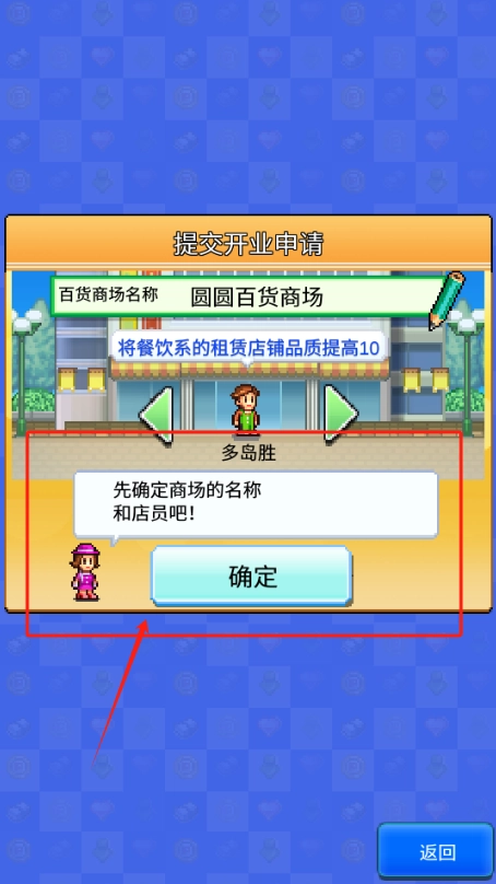 2、在输入框填写商场名称“圆圆百货商场”,挑选多岛胜作为店员,点击确定按钮即可开业。