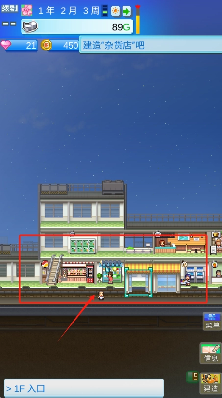 3、在红框标注的位置选择店铺选址,花费89G建造杂货店,建造过程中请注意留意右上角显示的时间进度与各类资源数值。
