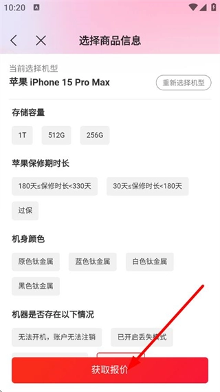 在设置好存储容量、保修时长、机身颜色等相关信息后,点击“获取报价”按钮,即可进入提交帮卖的页面。