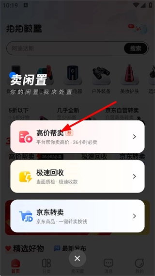 在选择闲置物品售卖方式的弹窗里,点击“高价帮卖”选项,即可进入高价帮卖的对应页面。
