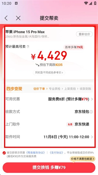 最后我们可以查看预估售价、可用优惠、收款方式等帮卖相关详情,确认无误后就能提交帮卖申请了。