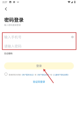 在密码登录界面,填写手机号与密码后,点击登录按钮,即可完成账号登录流程。