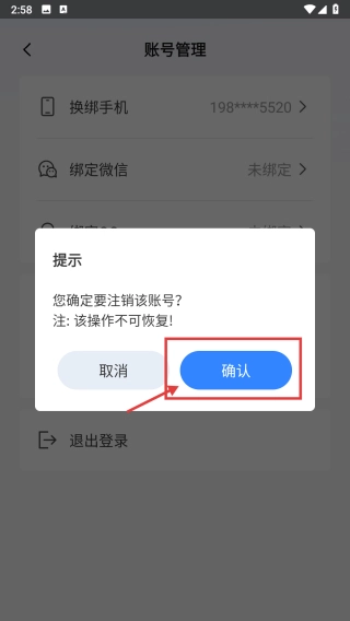 在账号管理页面,点击注销账号选项,弹出提示框。