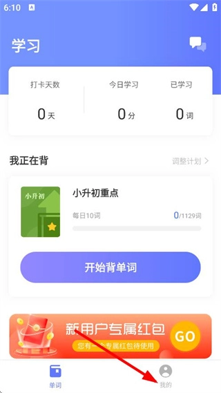 1、在学习页面,点击底部我的,进入个人中心页面。