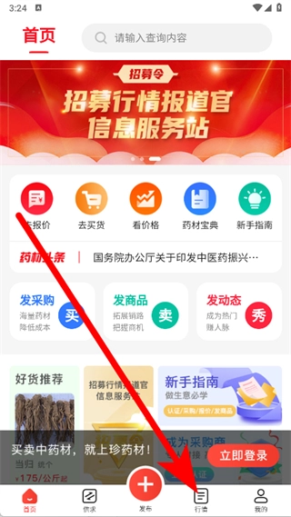 1、打开珍药材应用,点击底部导航栏中的“行情”选项,即可进入行情页面。