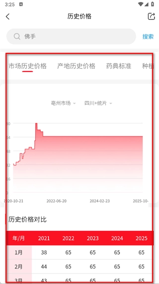 4、点击“更多价格”,即可查看该药材更详细的历史价格对比信息,同时还能了解最新的药材资讯。