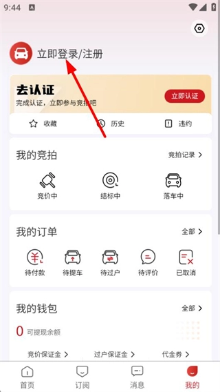 2、进入我的页面后,点击立即登录注册区域,可进入登录界面。