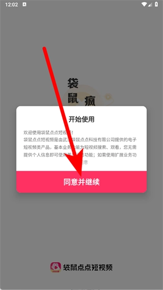 1、启动袋鼠点点短视频应用,当出现提示弹窗时,点击粉色的“同意并继续”按钮。