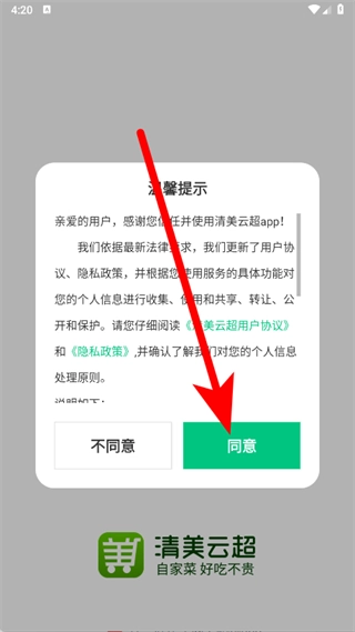 1、打开清美云超团购配送,在弹出的温馨提示页面,点击同意。