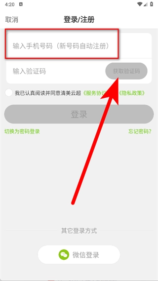 3、进入登录注册页面后,填写手机号码,再点击获取验证码。