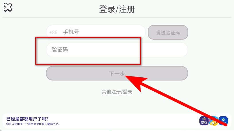 3、在验证码输入框中输入收到的验证码,接着点击下一步按钮。