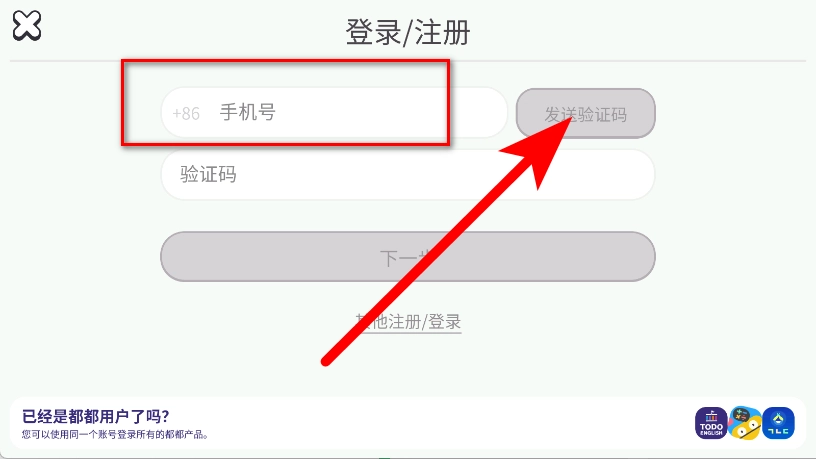 2、进入登录注册页面后,输入框中填写手机号,点击发送验证码按钮。