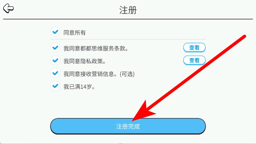 4、来到注册页面,确认勾选相关协议后,点击注册完成按钮,完成注册流程。