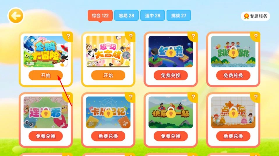 3、在训练游戏的选择界面,点击企鹅大冒险下方的“开始”按钮,即可进入训练前的准备页面。