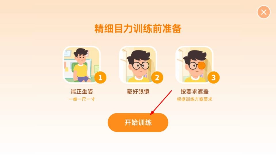 4、进入训练前准备页面,完成各项准备工作后,点击“开始训练”按钮,即可开展精细目力训练。