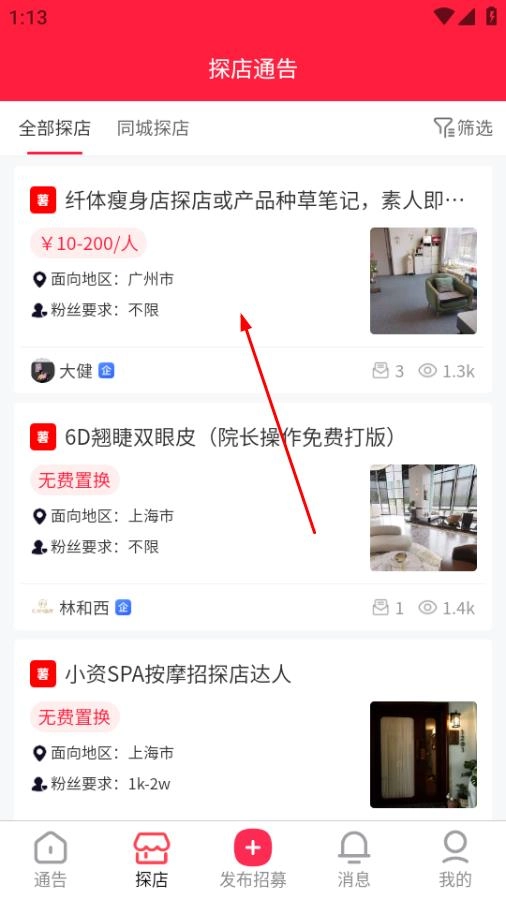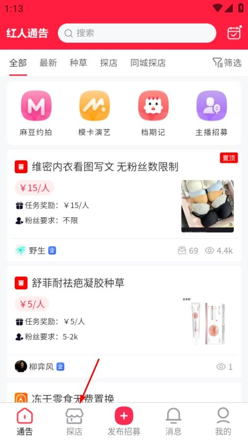 1、打开红人通告应用,点击页面底部导航栏中的“探店”选项,进入探店通告页面。