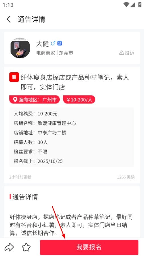 2、在探店通告页面,挑选你感兴趣的通告,点击进入该通告的详情页面。