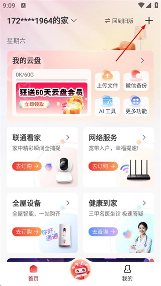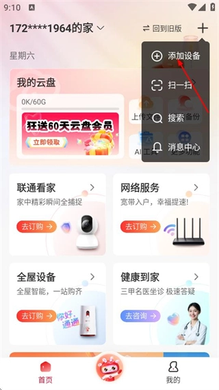 在联通智家首页,点击右上角的加号按钮,随即弹出功能选项菜单。
