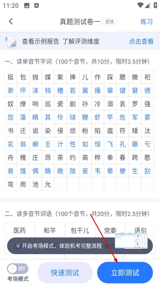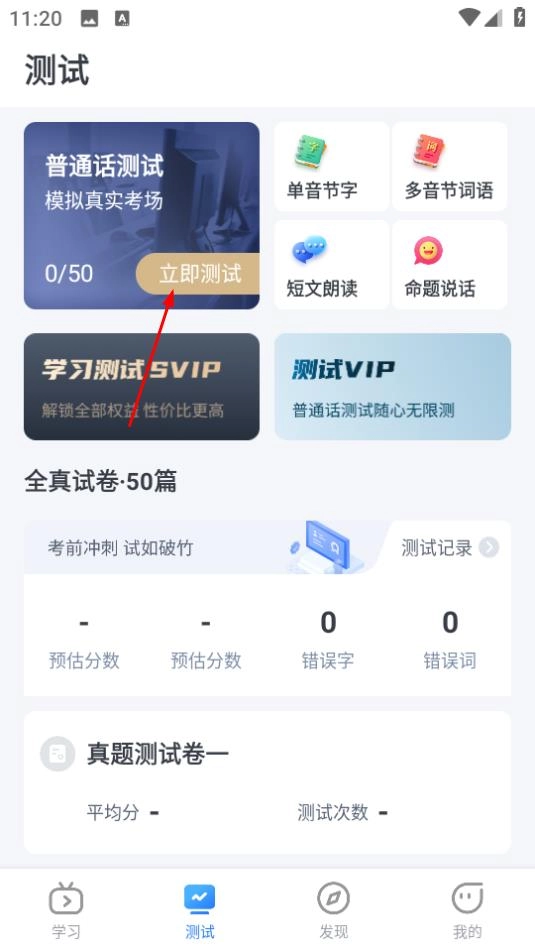 2、进入测试页面后,找到普通话测试板块并点击“立即测试”按钮,即可进入真题测试卷页面。